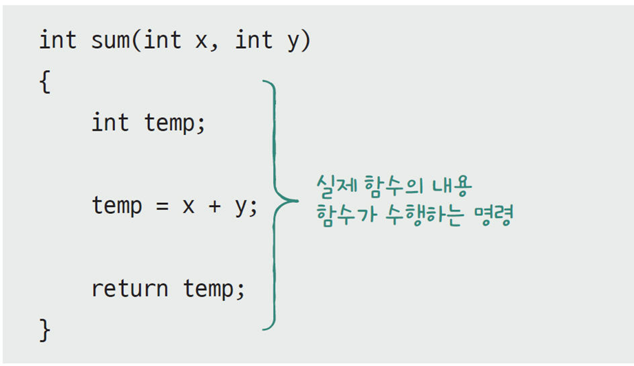 - 함수원형에 함수의 실행코드를 중괄호 안에 넣어 완성한다.