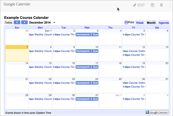 학습자가 강좌내용에서 볼 수 있도록 강좌에 구글 캘린더를 포함시킬 수 있다. 퀴즈 날짜, 근무 시간, 또는 학습자에게 관심이 될만한 다른 일정들을 공유하기 위해 구글 캘린더를 사용할 수 있다. 예를 들면: